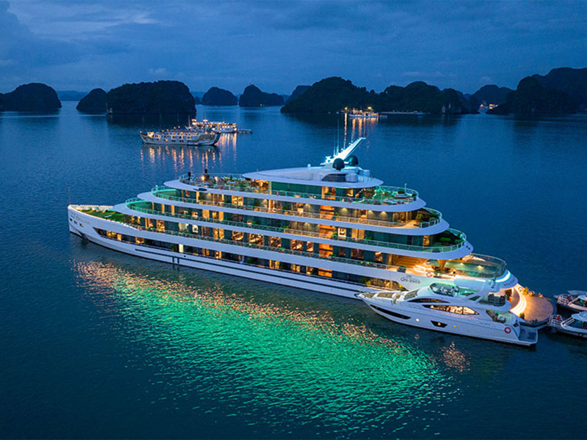 Buổi tối nổi bật với bữa tiệc hải sản 5 món, cùng trải nghiệm câu mực đêm dưới ánh đèn và tiệc đón năm mới rực rỡ. Không gian cabin sang trọng, cửa sổ lớn hướng biển cùng một số phòng có bồn tắm riêng tạo cảm giác thư thái tuyệt đối. Ngày thứ hai là dịp thiền hành tại Hang Tiên Ông, thăm làng chài Cửa Vạn và thư giãn với spa ngâm chân thảo dược. Giá du thuyền Hạ Long dịp Tết loại này từ 10 triệu đồng mỗi đêm với các du thuyền 5 sao.