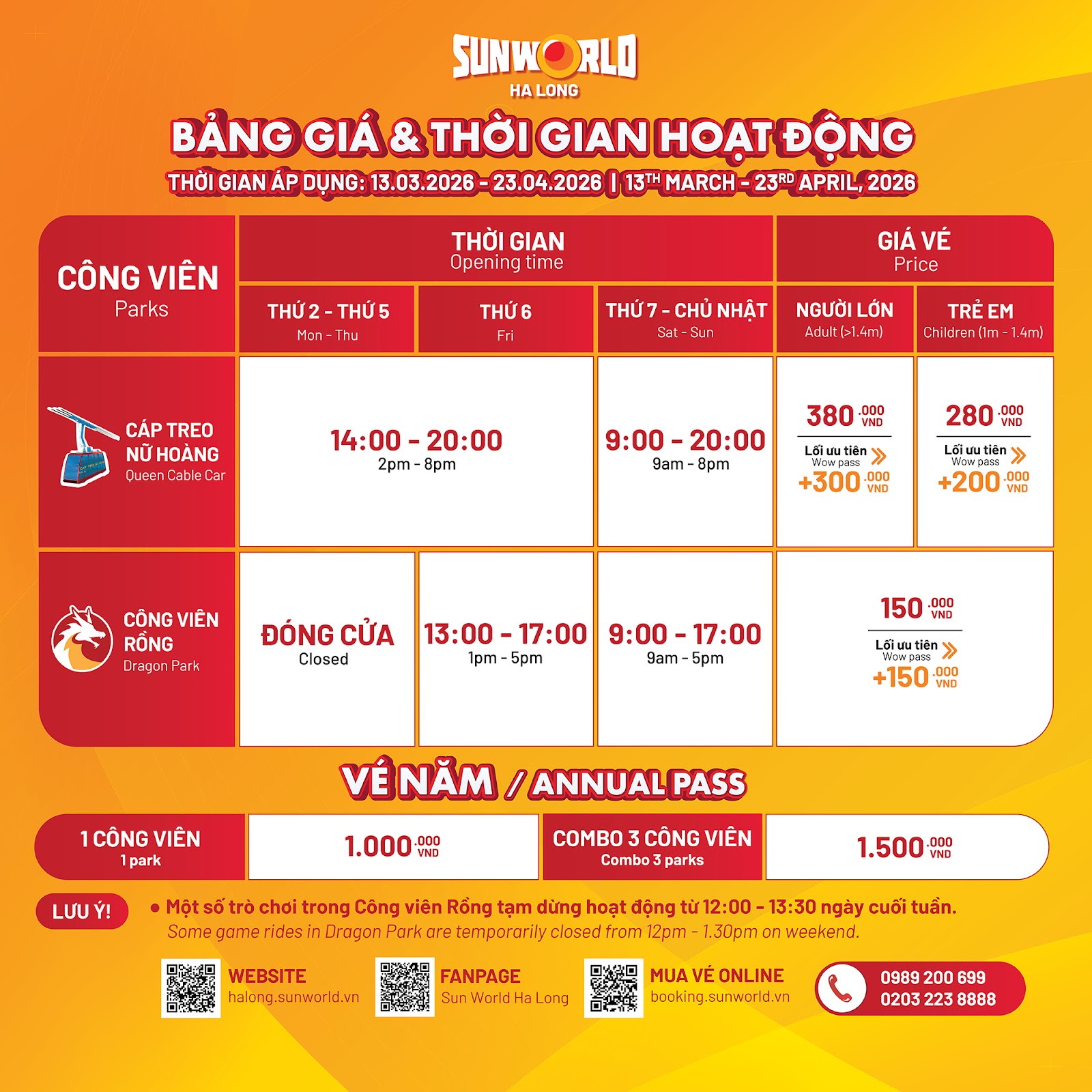 Yếu tố đầu tiên và cũng ảnh hưởng mạnh nhất đến giá vé tại Sun World Ha Long chính là thời điểm du lịch. Vào mùa cao điểm, đặc biệt từ tháng 5 đến tháng 8, khi học sinh nghỉ hè và nhu cầu du lịch tăng mạnh, giá vé thường được giữ ở mức niêm yết cao nhất và gần như không có nhiều chương trình ưu đãi sâu.